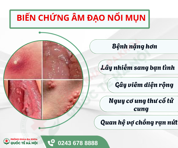 Từ vài nốt mụn nhỏ, vi khuẩn có thể xâm nhập sâu lên cổ tử cung, buồng trứng hoặc ống dẫn trứng. Khi đó, chị em dễ gặp các bệnh như viêm vùng chậu, tắc vòi trứng, rối loạn kinh nguyệt… Nếu không xử lý sớm, hậu quả có thể là vô sinh hoặc mang thai ngoài tử cung.