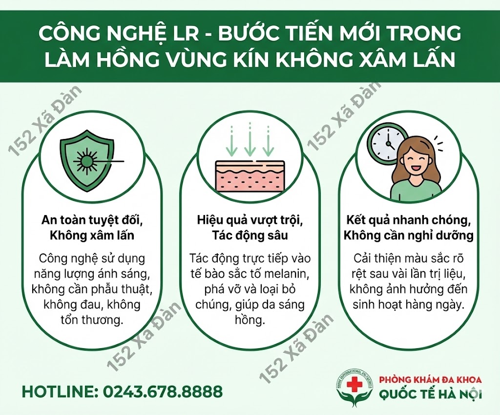 Ưu điểm lớn nhất của công nghệ LR là không xâm lấn – không đau – không cần nghỉ dưỡng. Quá trình thực hiện nhẹ nhàng, được kiểm soát chặt chẽ về mức năng lượng, phù hợp với đặc tính nhạy cảm của vùng kín. Sau liệu trình, nhiều chị em ghi nhận sự thay đổi tích cực cả về màu sắc, độ săn chắc lẫn sự tự tin trong sinh hoạt hàng ngày.