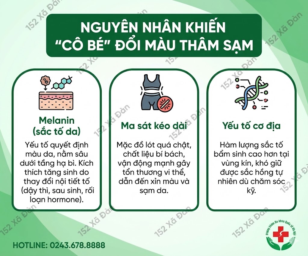 • Yếu tố cơ địa: Có những người bẩm sinh đã có hàm lượng sắc tố cao hơn tại vùng kín, dù chăm sóc kỹ vẫn khó giữ được sắc hồng như mong muốn.