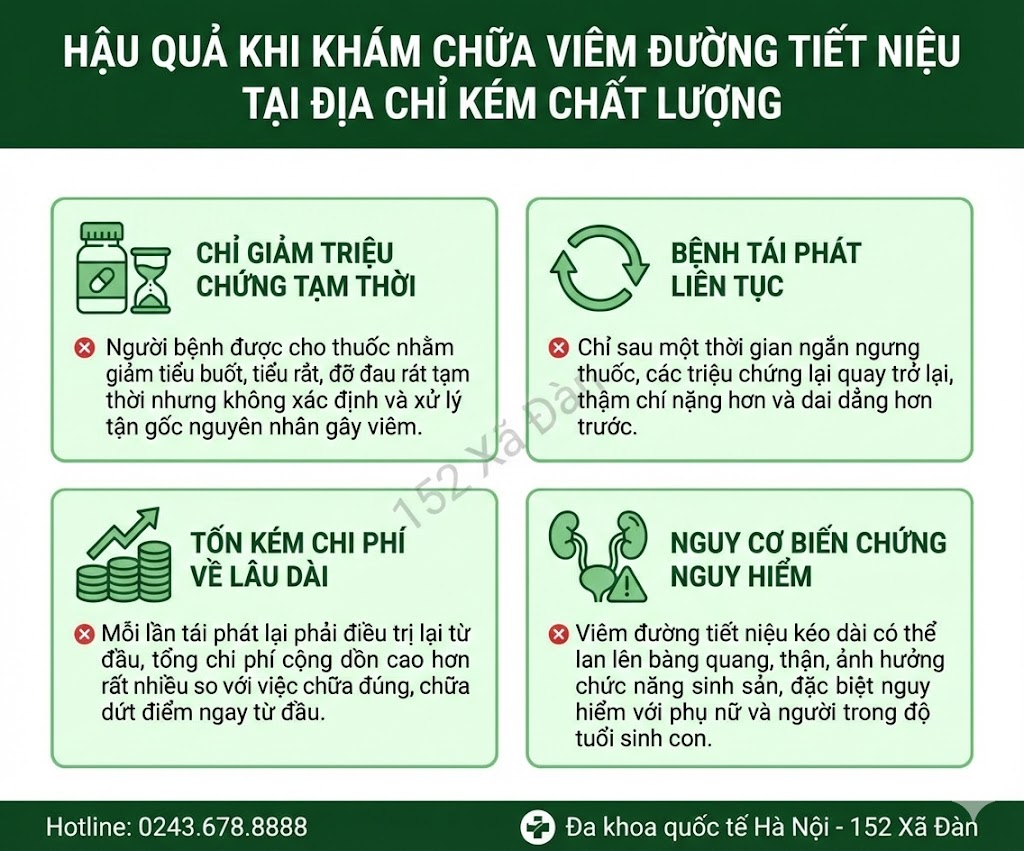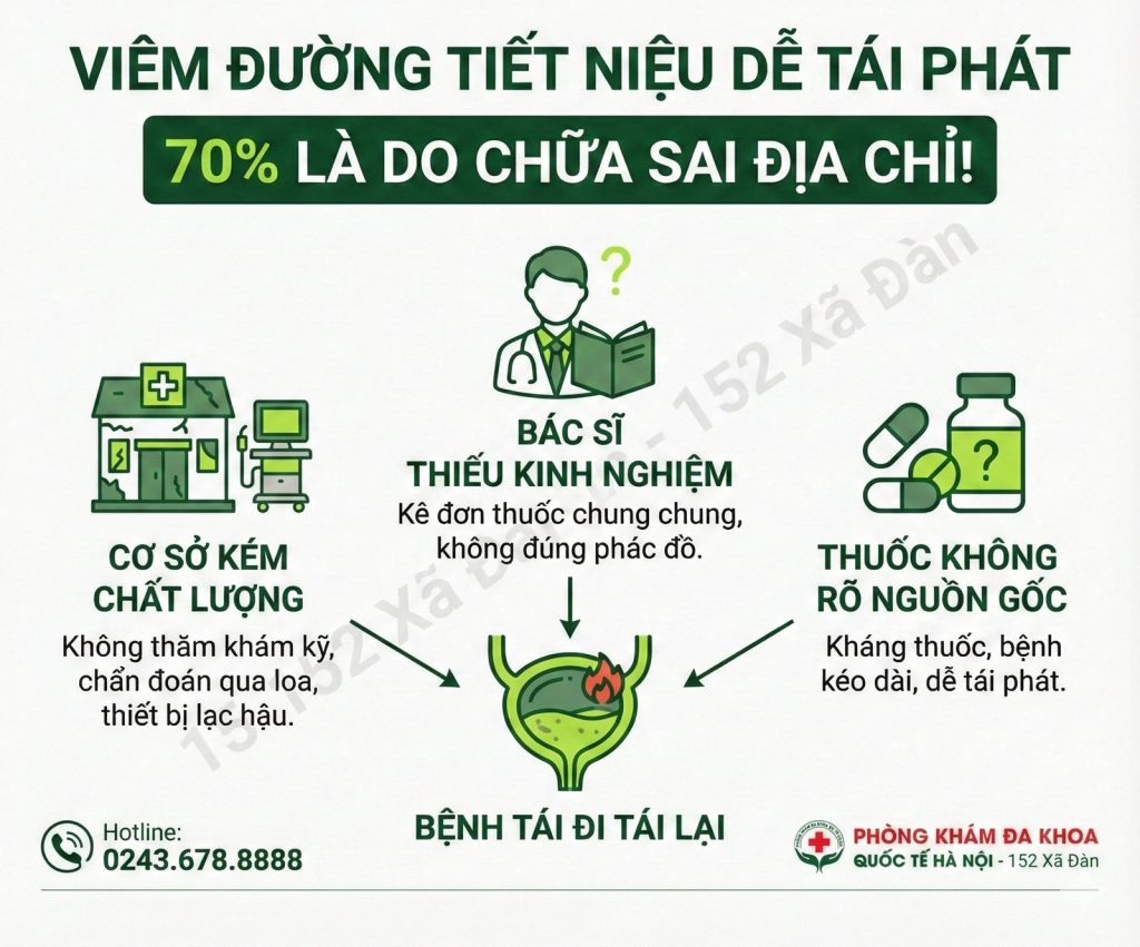 → Sai lầm lớn nhất không chỉ là mắc viêm tiết niệu, mà là chọn sai nơi điều trị, để rồi rơi vào vòng luẩn quẩn: chữa – đỡ – tái phát – tốn kém – lo lắng kéo dài.