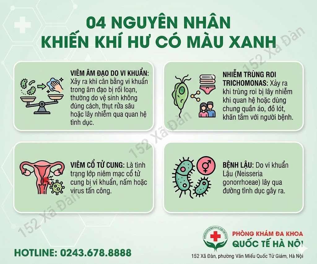 Khí hư màu xanh thường liên quan đến các nhiễm trùng âm đạo và các vấn đề phụ khoa khác. Một số nguyên nhân phổ biến bao gồm: