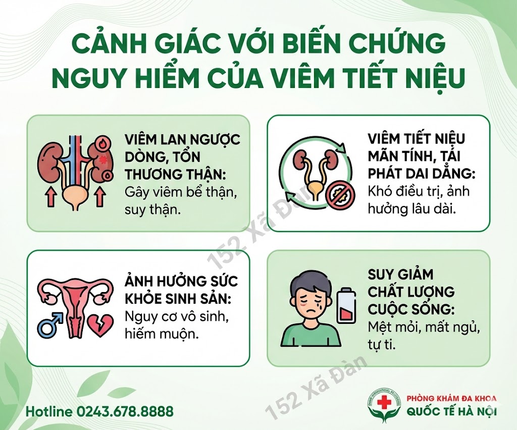 - Ảnh hưởng sức khỏe sinh sản: Viêm đường tiết niệu kéo dài dễ kết hợp với viêm phụ khoa, làm tăng nguy cơ viêm vùng chậu, rối loạn chu kỳ kinh nguyệt, giảm khả năng mang thai trong tương lai