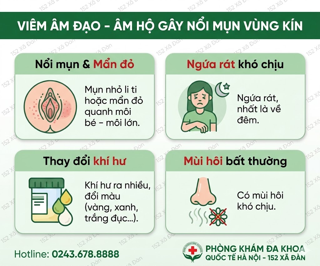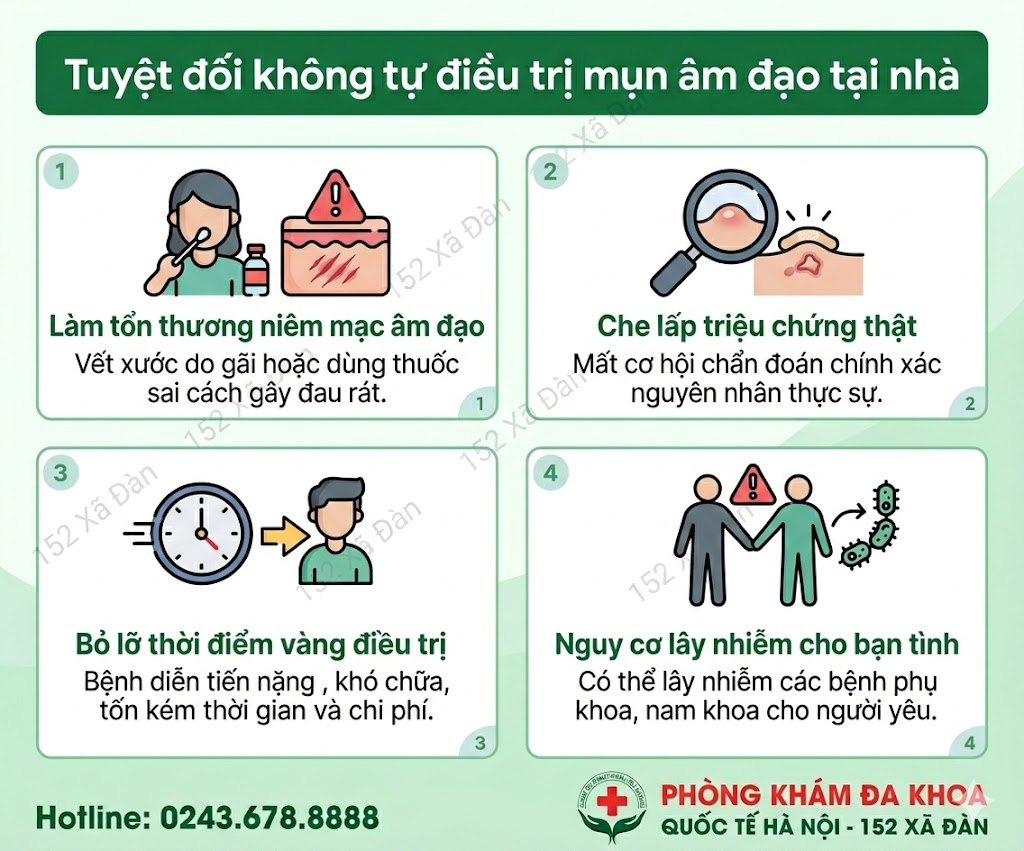 LƯU Ý: Nổi mụn âm đạo là triệu chứng của nhiều bệnh lý nguy hiểm, mỗi bệnh lý cần phác đồ điều trị khác nhau. Do đó, chị em nên chủ động thăm khám tại cơ sở chuyên khoa uy tín hoặc liên hệ bác sĩ chuyên khoa để được hỗ trợ chẩn đoán chính xác trước khi tiến hành điều trị.