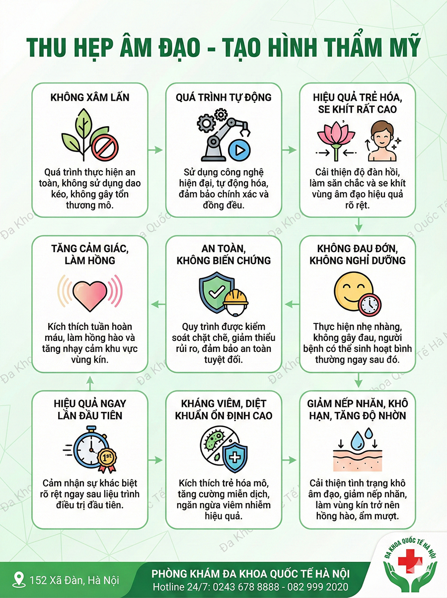 Tại Phòng khám Đa khoa Quốc tế Hà Nội, dịch vụ thu hẹp âm đạo – tạo hình cô bé được xem là một trong những thế mạnh hàng đầu, với quy trình chặt chẽ và đội ngũ bác sĩ thực hiện ở cấp độ chuyên sâu mà ít cơ sở ngoài công lập nào đáp ứng được: