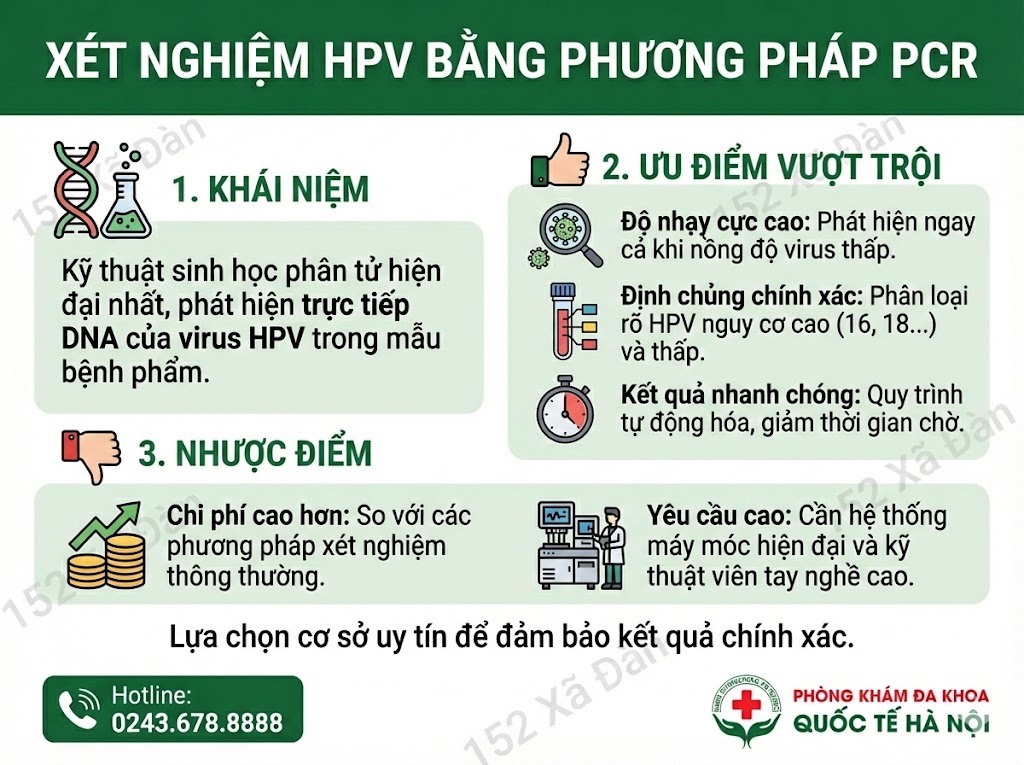• Xét nghiệm HPV DNA (HPV PCR): Cho biết virus HPV nguy cơ cao có đang tồn tại hay không. Phù hợp với phụ nữ từ 30 tuổi trở lên hoặc muốn tầm soát chuyên sâu